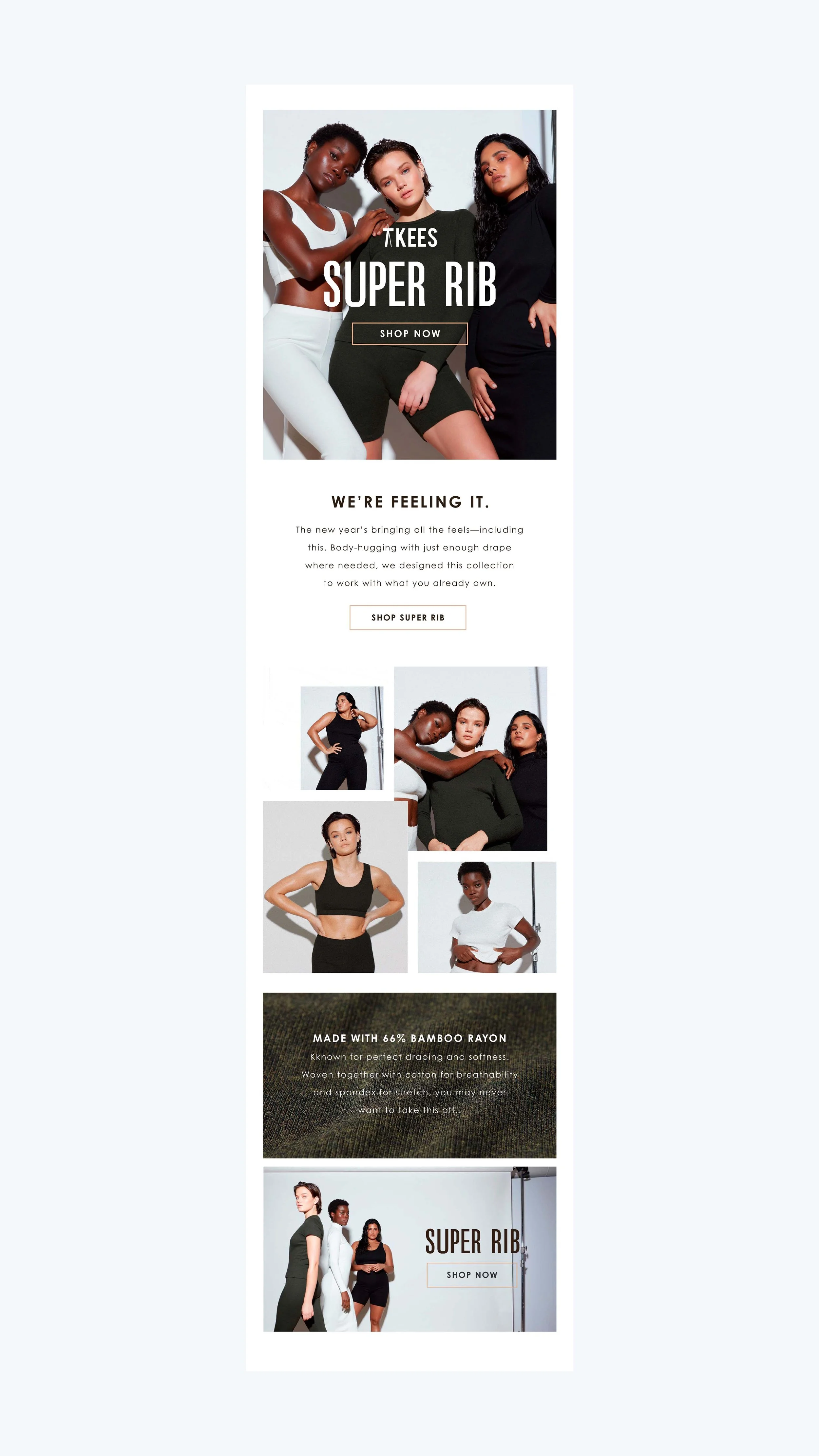 The Super Rib collection is a new product line for TKEES. When designing the assets, I made sure to combine blocks for both story-telling and shoppability.