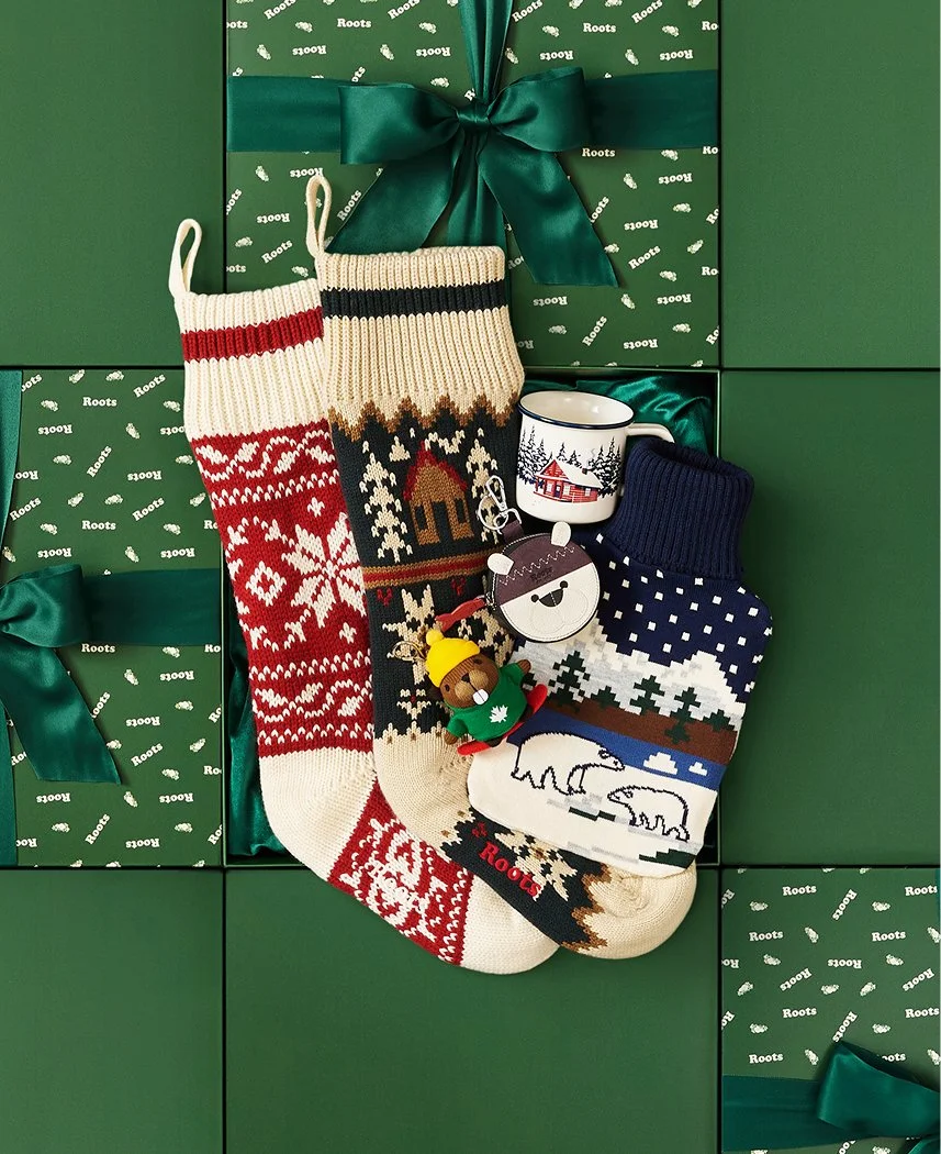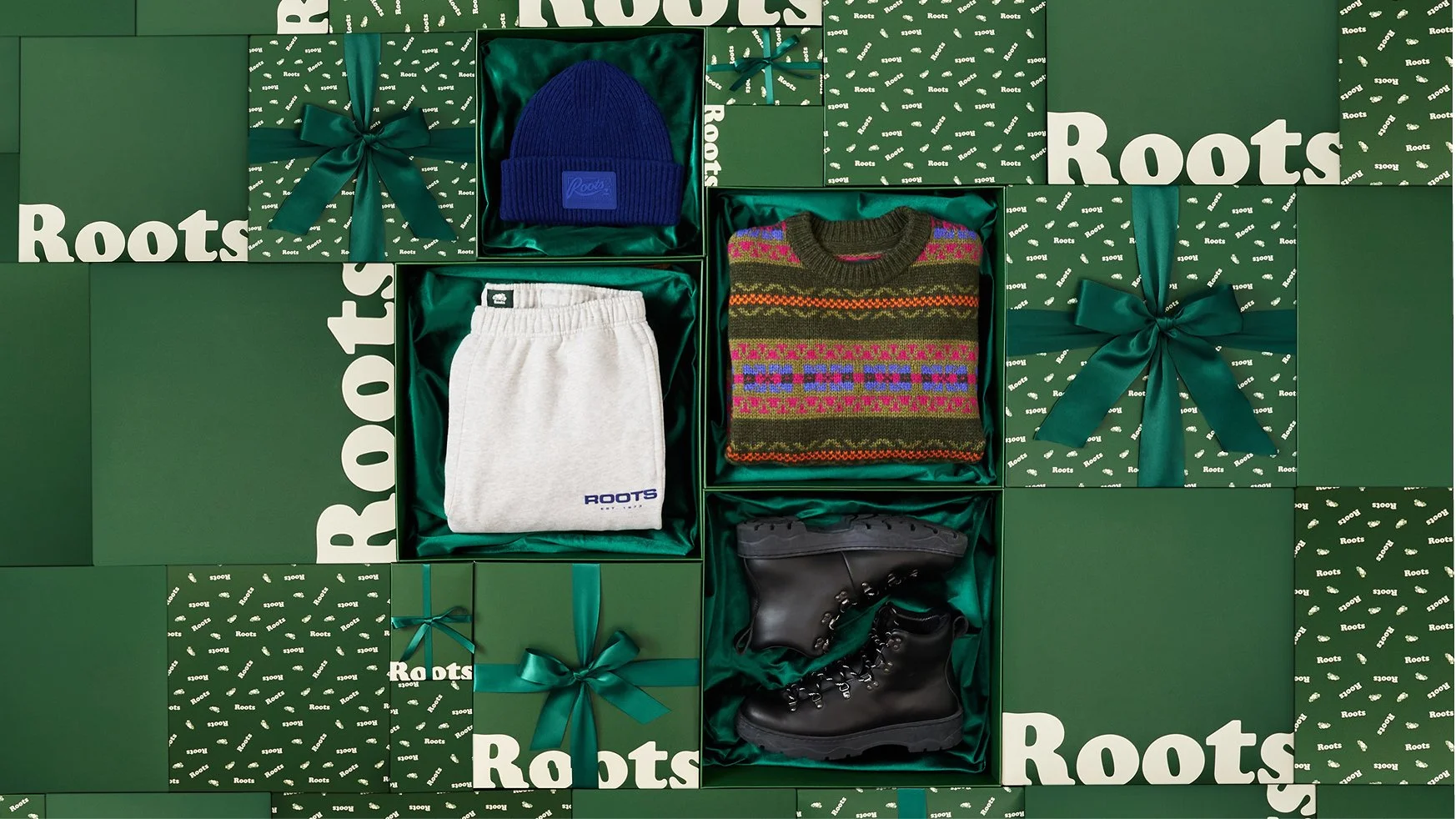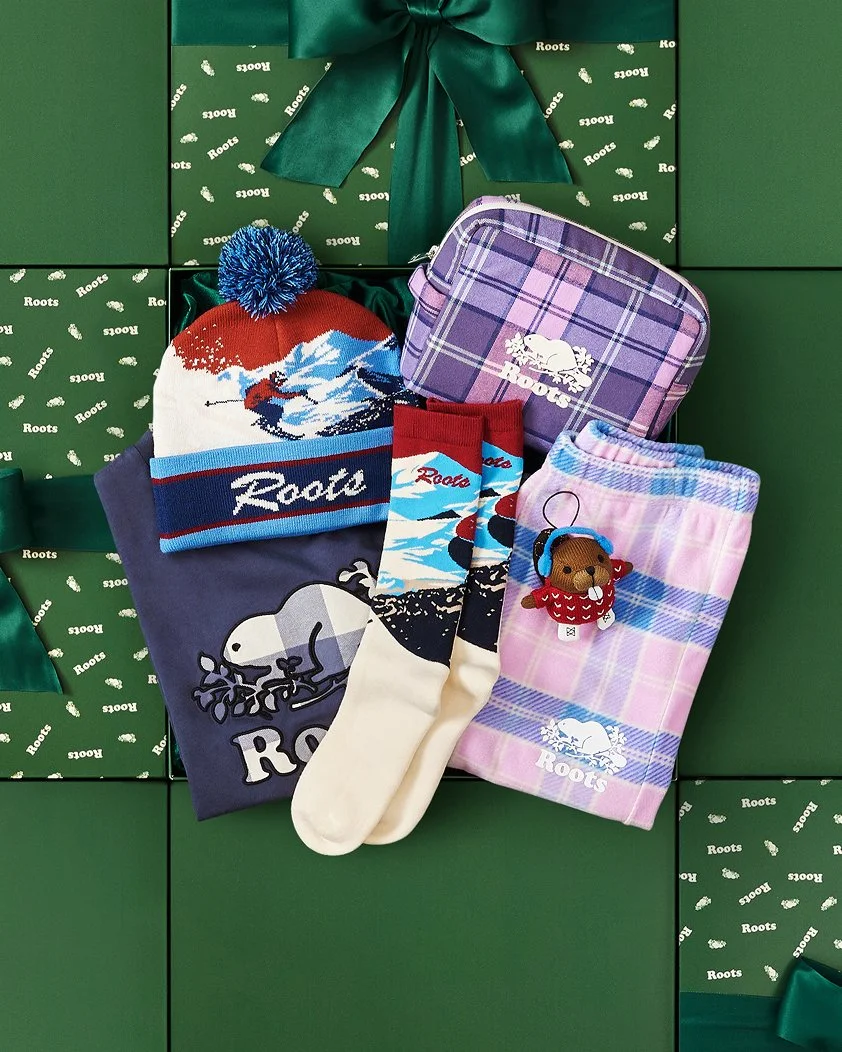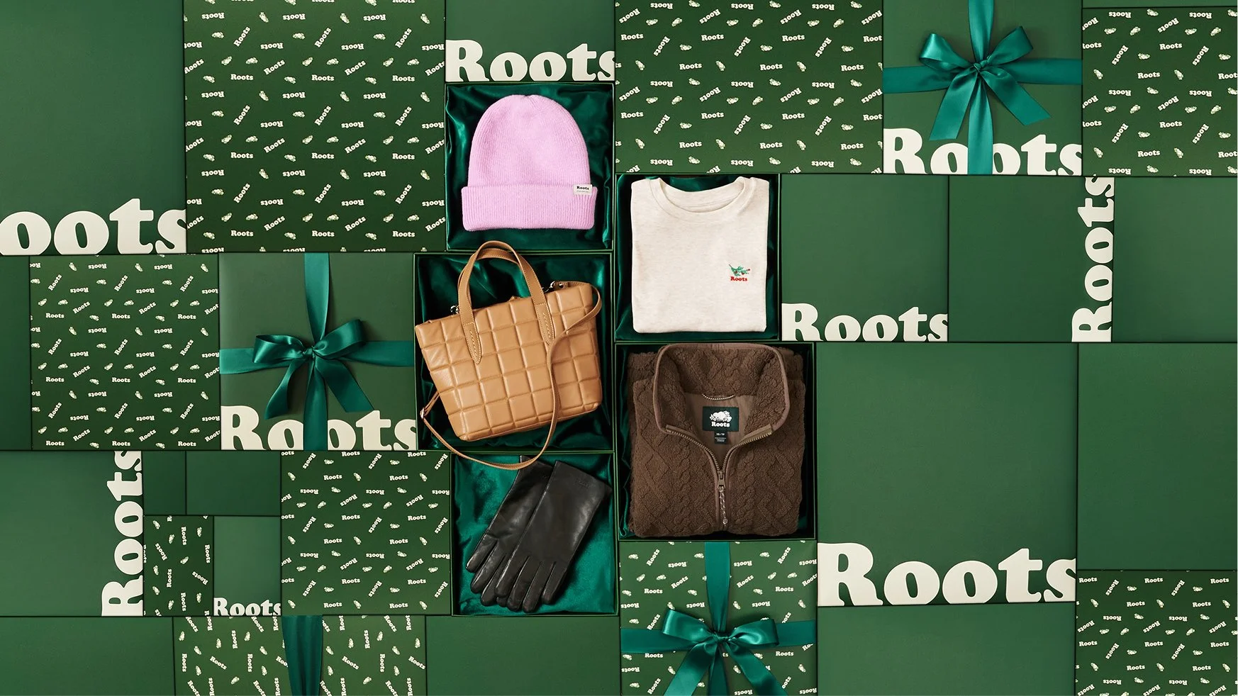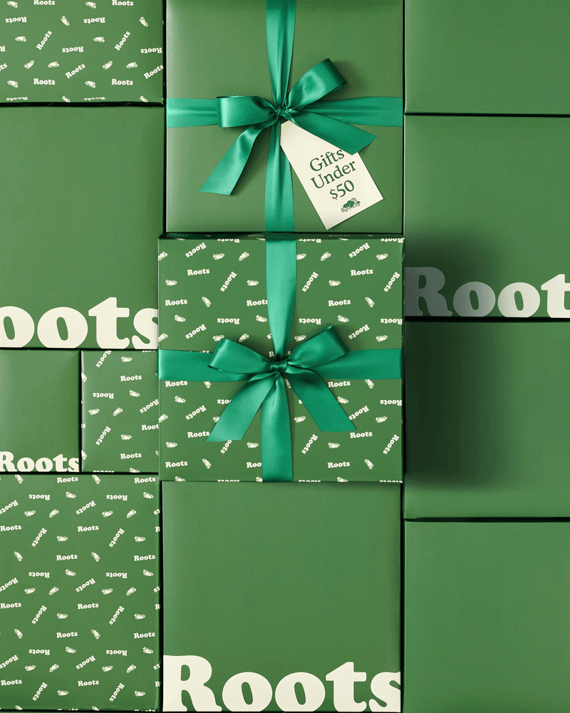The 2025 Roots Holiday Gift Guide is presented in a playful and immersive showcase of green gift boxes. Curated flat lays of opened boxes unveil thoughtful picks for anyone on your list.